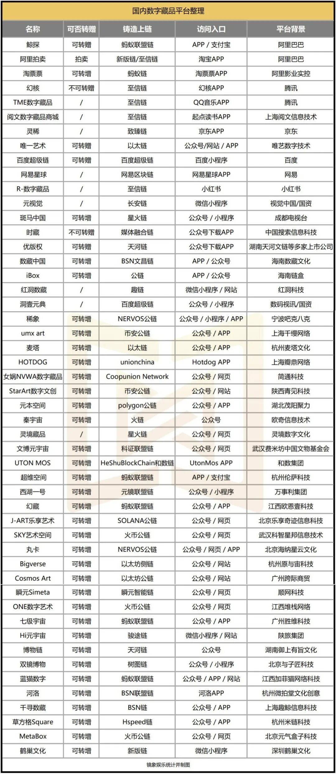 如果說,去年關于數字藏品的新聞都充滿光環,那今年以來,負面開始相繼出現,除了上述案例,周杰倫NFT被盜、散戶虧本跳樓等新聞,都為數字藏品行業的發展蒙上了一層陰影。如今,國內數字藏品平臺達500家左右,無論是BAT大廠還是中小型公司,都在押寶數字藏品賽道。大量玩家的涌入讓整個行業快速壯大,但新興行業也難免面臨亂象,知識產權爭議、同質化競爭等都是擺在明面的問題。不少衍生出二級交易市場的數字藏品平臺,更是直接玩起了“金融游戲”。在這場游戲中,有人暴富,有人血虧,每天都有平臺在發布新的數字藏品,也有炒價者試圖通過轉賣牟利。當然,當下數字藏品行業亦不缺真正用心的玩家,行業面臨的市場監管力度也在不斷增大,對這一有望在2026年突破300億規模的市場來說,它需要時間沉淀下的大浪淘沙,需要不斷以良幣驅逐劣幣,方能走向黎明。數據顯示,截至2022年5月,國內上線運營以及公布上線計劃的數字藏品平臺達到500家左右。這是一個極為恐怖的數字,國內首個數字藏品交易APP幻核是2021年8月發布的,距離今年5月僅過去10個月時間,也就是說,過去10個多月里,平均每天至少上線一到兩家數字藏品平臺。這500多家平臺中有大眾較為熟悉的,比如阿里的鯨探、騰訊的幻核、京東的靈稀、網易的網易星球、百度的百度超級鏈、小紅書的R-SPACE等,它們都是互聯網大廠或知名社交平臺推出的產品。目前,發力較早的阿里和騰訊旗下已經不止一款數字藏品交易平臺,除了鯨探,阿里系還推出了阿里拍賣、淘票票,除了幻核,騰訊系也還有TME數字藏品、閱文數字藏品商城。宏觀來看,國內500多家數字藏品平臺背后勢力復雜,不過,文化科技類公司明顯占比較高,比如投資優版權的天舟文化、推出元視覺的視覺中國、投資Zverse星圖比特的風語筑、推出凰家藝品的鳳凰網、推出瞬元Simeta的順網科技等。此外,另一個值得關注的點是,國資也在入局數字藏品賽道,比如成都電視臺推出了斑馬中國、陜旅集團推出了Hi元宇宙,此外,諸如洞壹元典、唯一藝術、元視覺、Bigverse等數字藏品平臺背后也站著國資。不過,在500余家數字藏品平臺中,有國資背景的并不多。過去10多個月里,關站、停運、下架的數字藏品平臺并不少,但是,新的平臺也在如雨后春筍般誕生。五月底,中文在線便上線了面向元宇宙的第一個數字藏品平臺第五境面,這也讓國內數字藏品平臺的總量整體呈快速上漲趨勢。