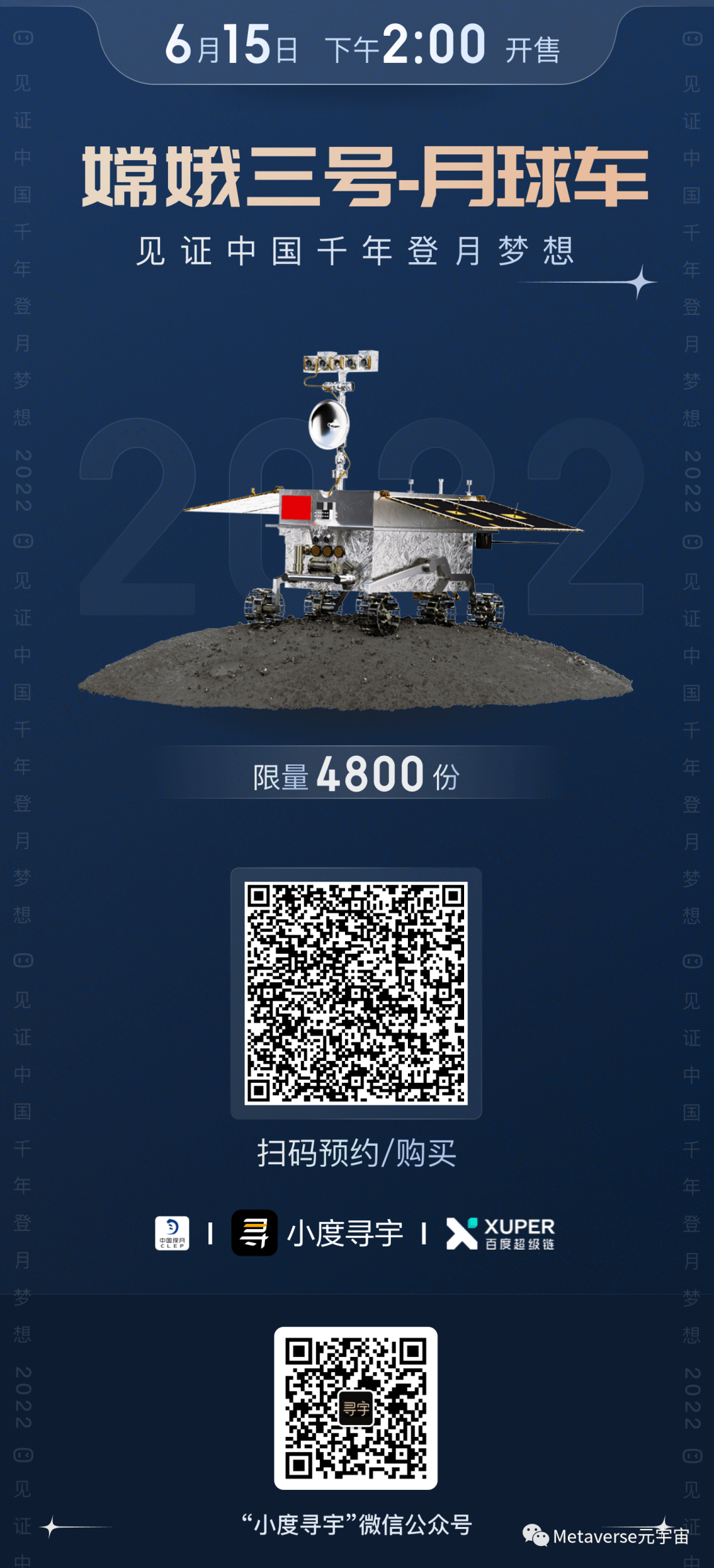 放之嫦娥三號-月球車,這代表著我國航天器首次地外天體的成功軟著陸與巡視勘察的“記號”,也僅有一次。最后再次強調,這4800份見證千年登月夢的“嫦娥三號-月球車”數字藏品,將于15日(明天)下午2點正式在小度尋宇平臺對外開售。