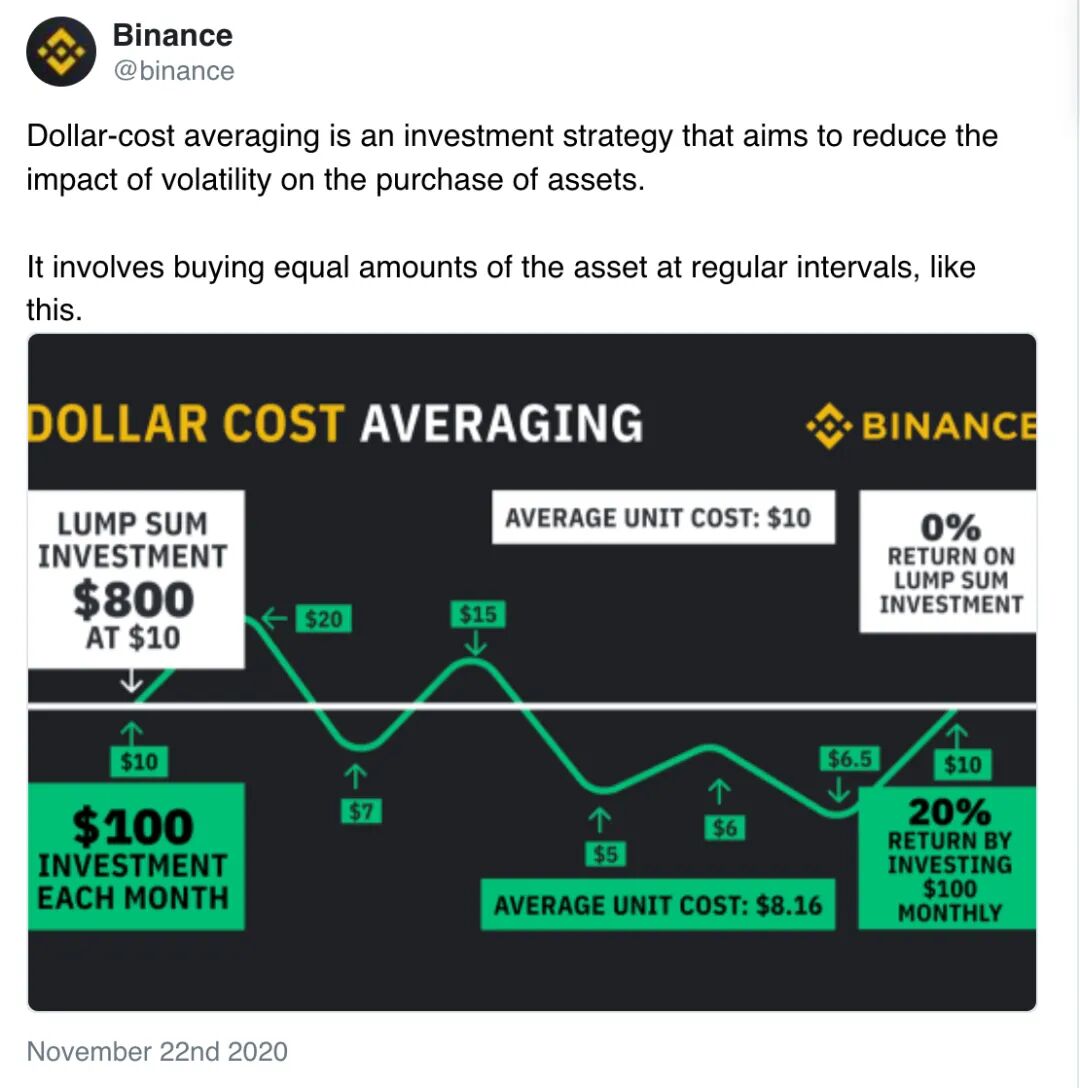 Binance在推特上表示:美元成本平均是一種投資策略,旨在減少波動對資產購買的影響。它涉及定期購買等量的資產。