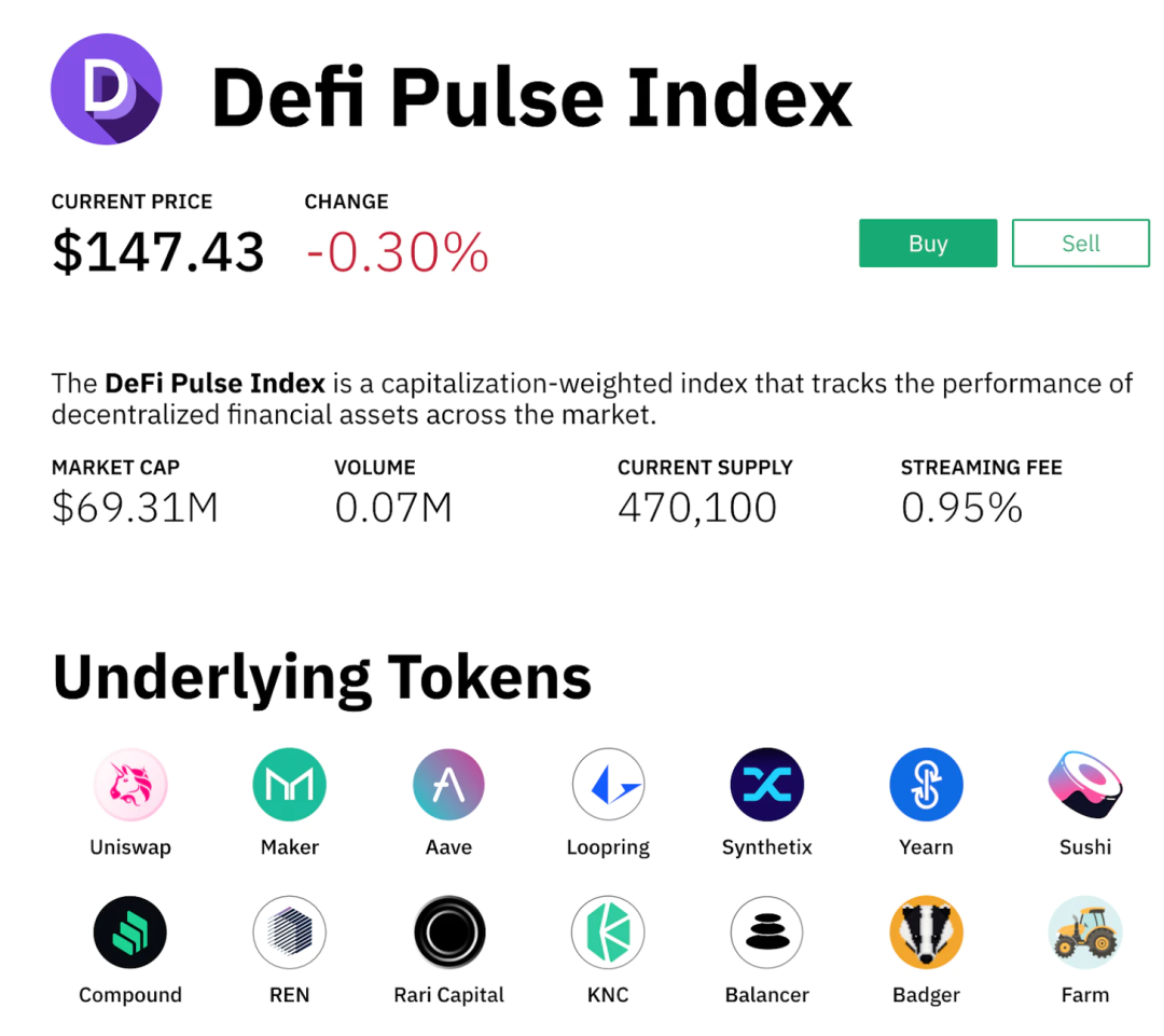 多樣化到特定的代幣是一回事。但是指數(index)呢?指數是一籃子代幣,這意味著它們代表了多元化本身的一個縮影。例如,Index Coop 的DPI將藍籌 DeFi Token捕獲到一個單一的籃子Token中,將經過實戰考驗的 DeFi 協議的風險和回報分散到多個Token中。