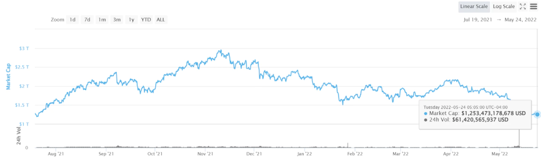 快速瀏覽一下市場就會發現,我們已經與 ATH 漸行漸遠。據CMC稱,加密貨幣的市值在 11 月初達到頂峰,略低于 3 萬億美元。在撰寫本文時,加密市場的總值約為 1.25 萬億美元。在 7 個月內下降了 58%。即使考慮到波動性,我們仍然看到了“20% 跌幅”的三倍。