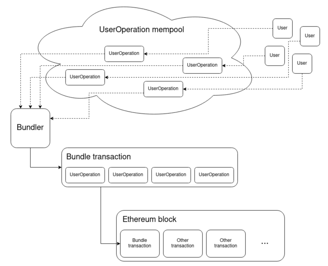 ERC-4337 嘗試通過額外的協議手段實現和 EIP-2938 相同的事情。用戶需要發送稱為用戶操作(user operations)的鏈外消息,這些消息由區塊提議者(proposer)或為區塊提議者生成bundles的構建者(builder)批量收集并打包成單筆交易。提議者或構建者負責過濾操作以確保他們只接受支付費用的操作。用戶操作有一個單獨的 mempool 存儲池,連接到這個存儲池的節點會進行 ERC-4337 特定的驗證,以確保用戶操作在轉發之前能夠支付費用。