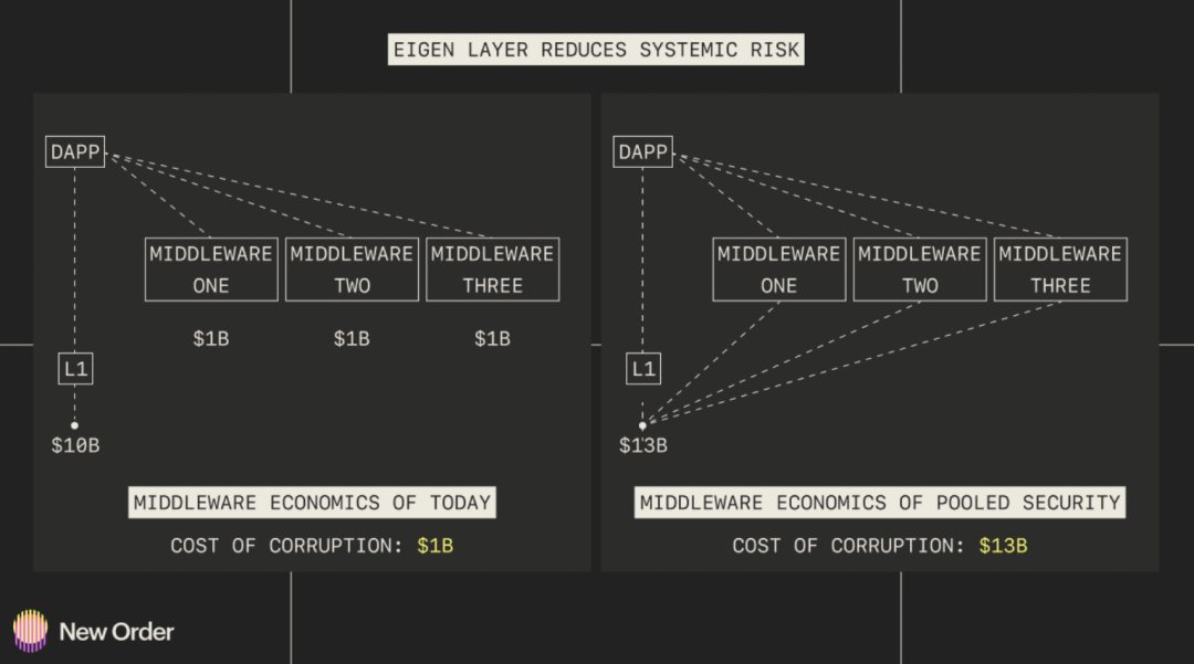 獲得重質押的 ETH 安全性將大大降低中間件、側鏈和一般去中心化技術堆棧的擴展成本。我們相信,自 2015 年首次引入以太坊以來,Eigen 將為去中心化網絡的構建方式帶來最顯著的變化。