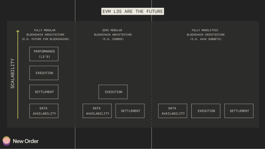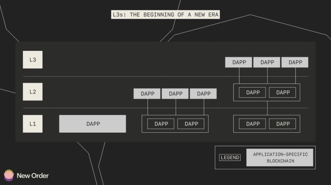 Layer 2 (L2) 通過降低 Gas 費用和增加吞吐量來提高以太坊的可擴展性。由于這些可擴展性因素,以及存在的權衡,L2 必須選擇針對特定項目進行優化。Layer 3(L3)是基于 L2 構建的特定于應用的區塊鏈,旨在減輕這些權衡并進行更多改進。它們類似于Cosmos、Avalanche 和 Polkadot 等應用鏈環境,但受益于構建在模塊化區塊鏈協議棧而不是單體鏈協議棧上。因此,部署一個完全模塊化的區塊鏈基礎設施堆棧,包括一個通用的 L2 以及可定制的 L3,將標志著單體應用鏈生態系統時代的結束,以及去中心化應用開發新時代的開始。