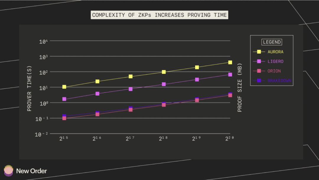 許多具有簡潔證明大小的現有 ZK 方案和算法,在證明生成時間(也稱為證明)期間會產生高開銷,這限制了它們的效率和可擴展性。為了解決這個問題,Supranational、Ingonyama 和 DZK 等項目正在努力提高證明生成的效率。然而,重要的是要認識到這種硬件加速只是高效證明的部分原因。在算法層面、軟件層面和其他方面都需要進行優化。同樣重要的是,所述系統要保持足夠的去中心化,這在實踐中很難實現。