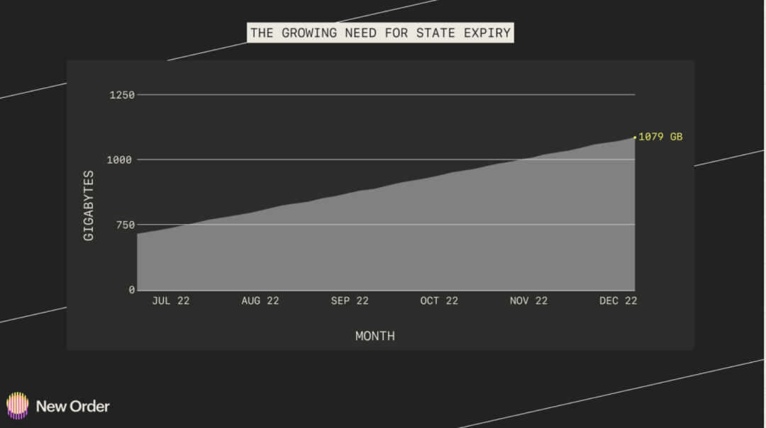 還存在對等(P2P)網絡上 Blob 交易的實際 Gossiping 問題,因為這些 Blob 的大小比當前正在 Gossip 的任何事物都大得多。這需要進一步的研究,目前 Paradigm 正在探索。看看這將會發生什么,以及以太坊網絡是否可以處理這種進一步的狀態膨脹和數據,這將是很有趣的。無論如何,很可能需要狀態到期來限制以太坊狀態的增長——目前以太坊狀態的增長達到了瘋狂的 1079 GB 以進行區塊鏈完全同步,并且每天都在增長。狀態到期將通過狀態租金來實現,因此可以將狀態出租到鏈下存儲,或者通過每月或每周刪除狀態,然后將其存儲在存檔節點上(不幸的是,此時它們非常中心化)。